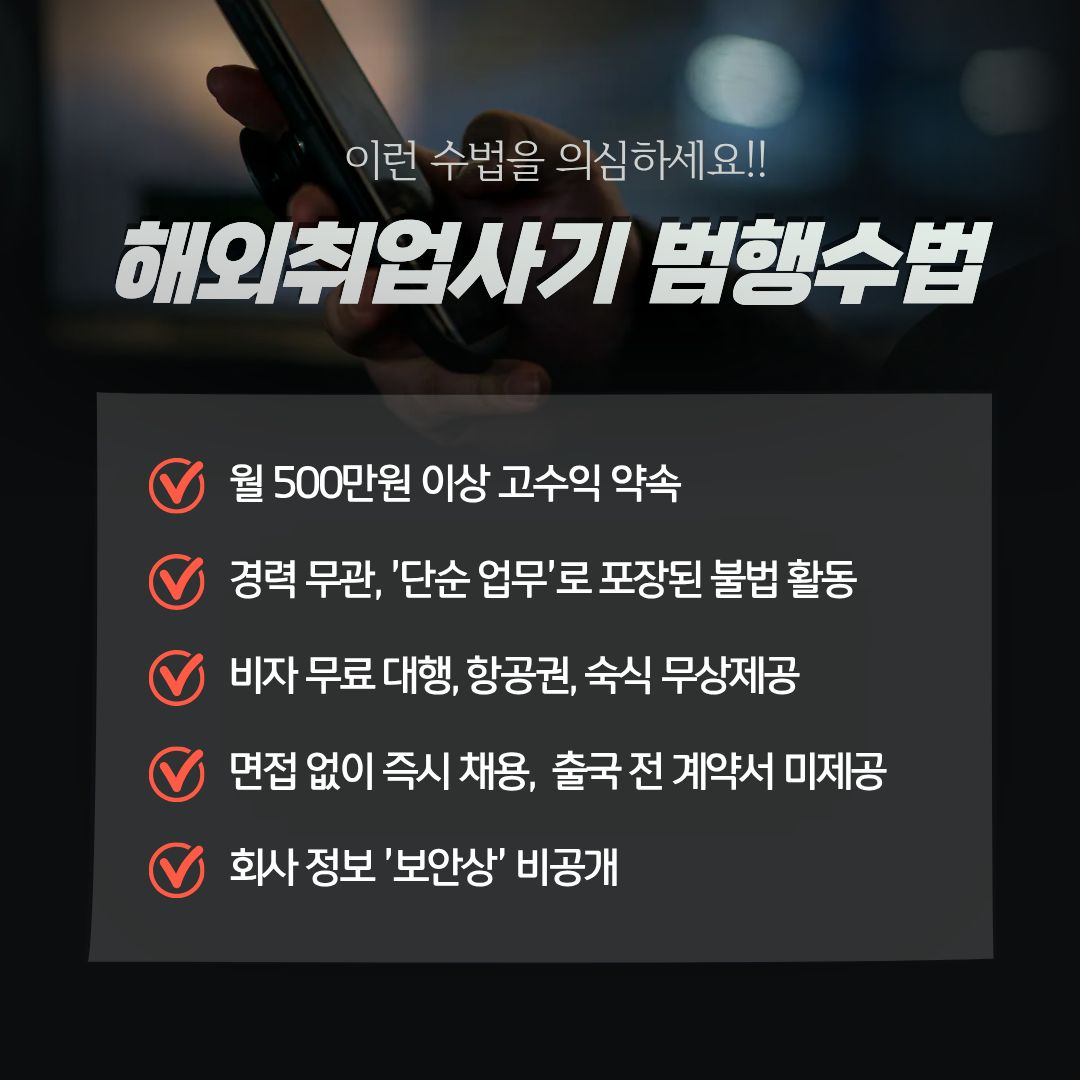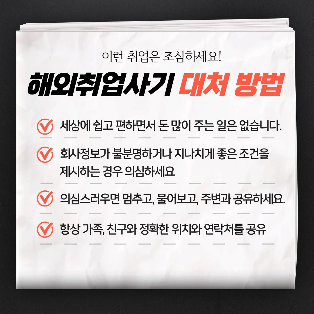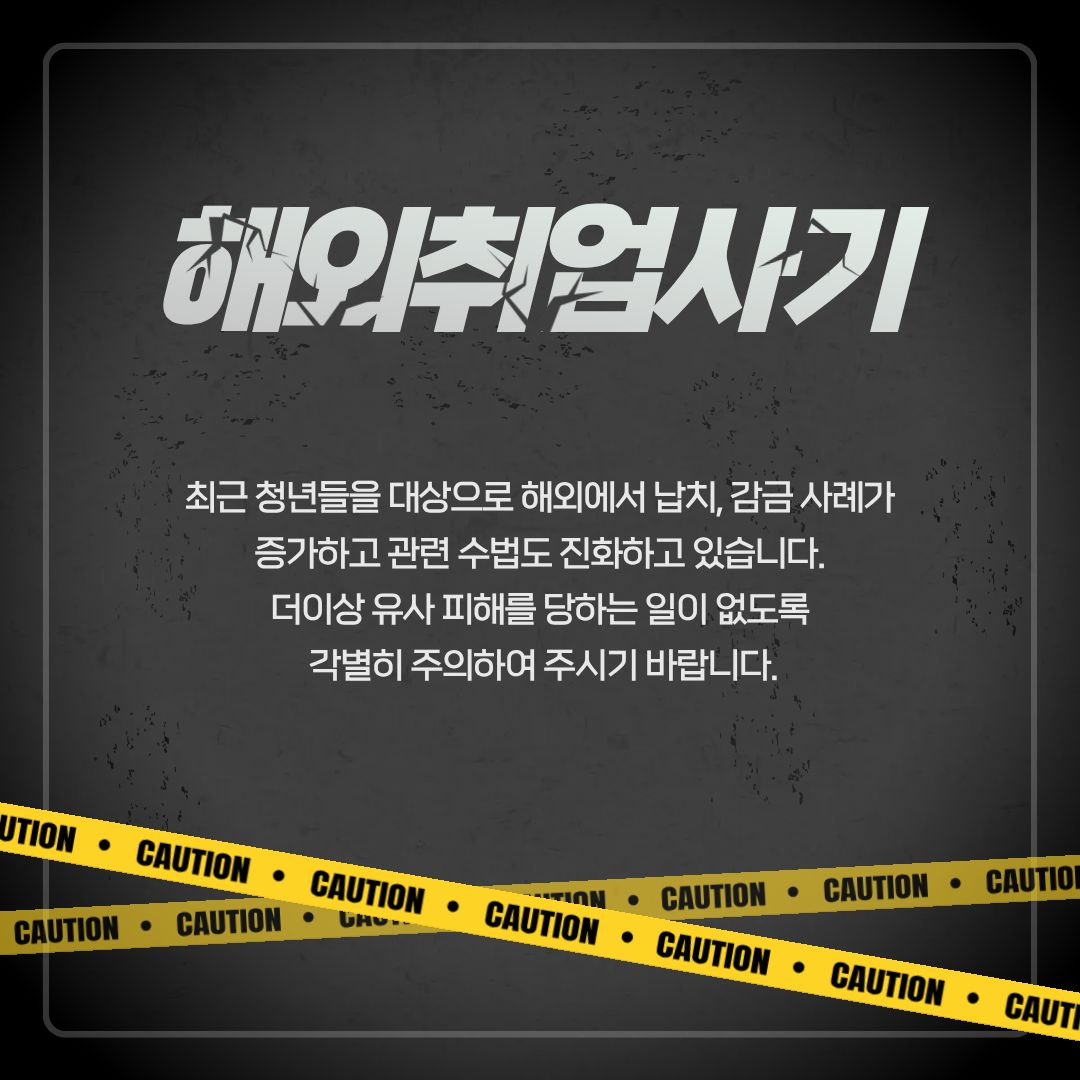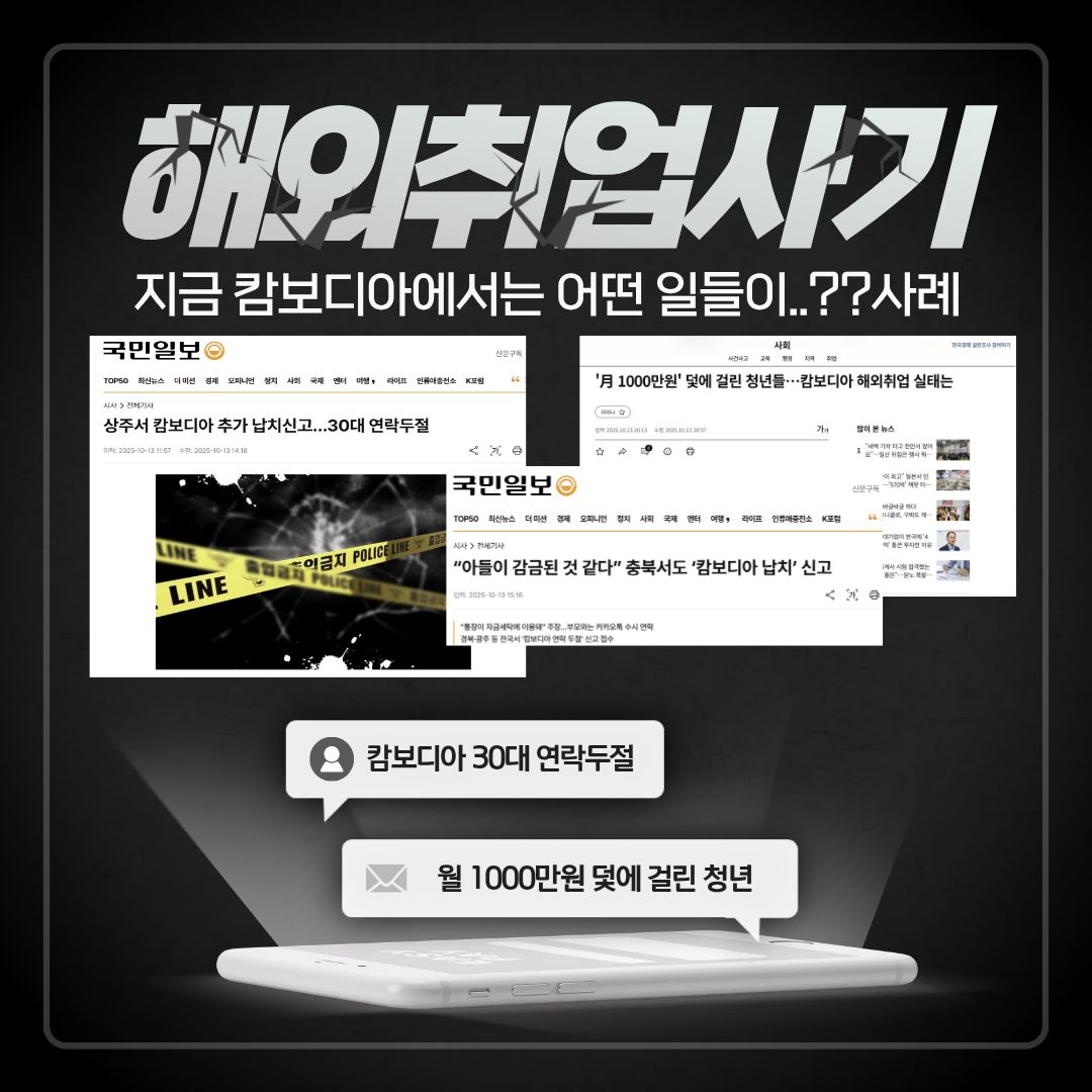 학생공지 학생공지 일반공지 장학/학자금 공지 감염병안내 공모/모집/시험 도서관 생활관 기부금공개 업무추진비공개 보육교원연수원 기타공고 충청대학교_대표-학생공지(대표_충청마당_공지사항_학생공지) 상세보기 - 제목, 내용, 파일, 작성자, 조회수, 작성일, 학과공지, 주소링크 정보 제공 [노란화분] 해외 취업 사기 범죄 예방 안내 작성자 : 이정민 작성일 : 2025-10-23 조회 : 150 최근 해외 취업 사기 범죄가 심각합니다. 주의하세요. 파일 png 문서 캄보디아 범죄 예방1.png png 문서 캄보디아 범죄예방 2.png png 문서 캄보디아 범죄예방 3.png png 문서 캄보디아 범죄 예방 4.png png 문서 캄보디아 범죄예방 5.png 주소링크 목록 게시물삭제 광고 반복작성 욕설 본인삭제 게시물삭제 이전글 [인권센터] 대학생 여성 1인 가구 대상 보안장비 무상지원 안내 다음글 【취업허브센터】 2025년 졸업특화프로그램 『인적성 시험 꿀팁 대방출 프로젝트』 운영 안내